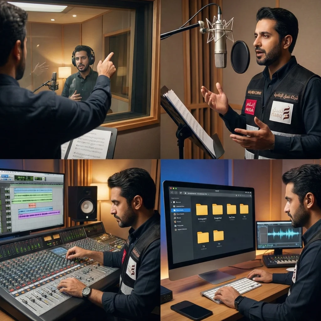 3. التسجيل والتوجيه: يشرف مخرج فني على عملية التسجيل لضمان إيصال الإحساس المطلوب في كل جملة.
