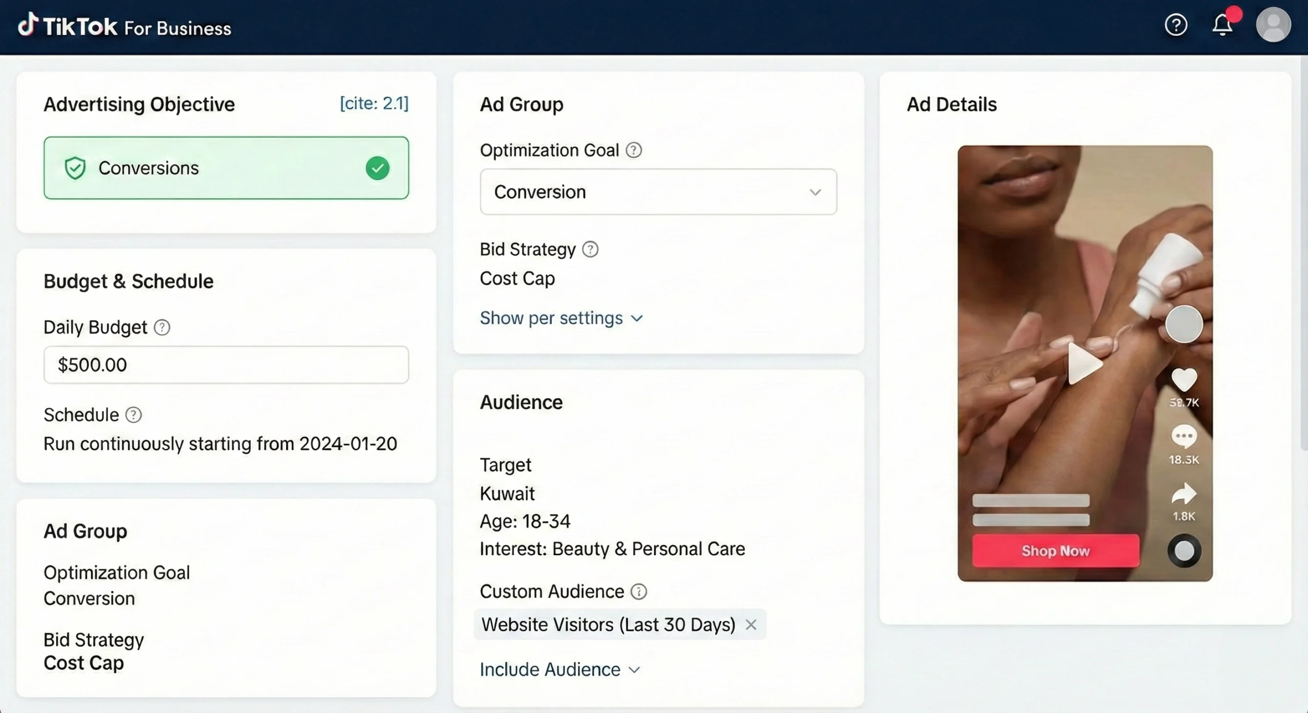 تيك توك منصة سريعة ونشطة طوال اليوم. نحن لا نعتمد فقط على التوقيت، بل على الخوارزمية الذكية. نطلق الحملة ونراقب الأوقات التي يتحقق فيها أعلى معدل تحويل (Conversion)، ونكثف الصرف في تلك الأوقات لضمان أقصى استفادة.